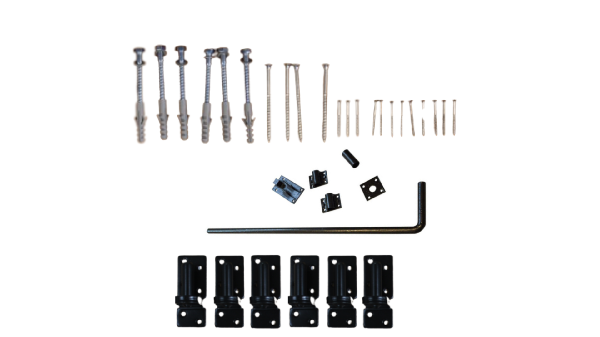 Inhoud set: 2x Kozijn hout, 1x Bovenregel kozijn, 1x Plank voor aanslag tussen de deuren, 4x Schroeven voor bevestiging van het kozijn, 6x Plaatduim inclusief schroeven voor bevestiging, 6x Slagpluggen voor bevestiging van kozijn aan de muur of paal (kozijn is niet geschikt om los in de grond te staan), 1x Grondpen, 2x Aanslaglat.