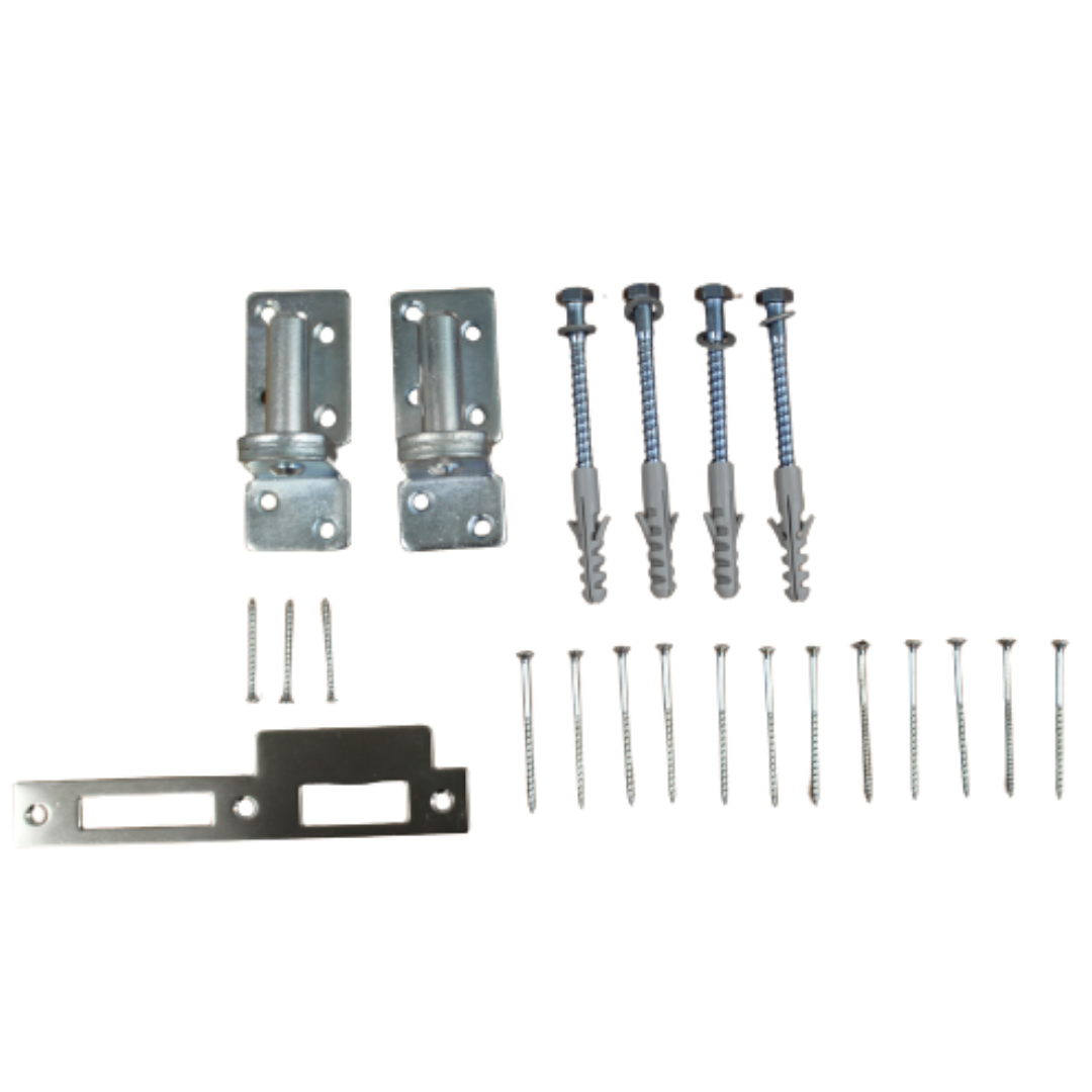 Inhoud set: 2x Kozijn hout, 2x Plaatduim inclusief schroeven voor bevestiging., 4x Slagpluggen voor bevestiging van kozijn aan de muur of paal (kozijn is niet geschikt om los in de grond te staan), 1x Sluitplaat voor dag-nachtslot inclusief schroeven, 1x Aanslaglat.