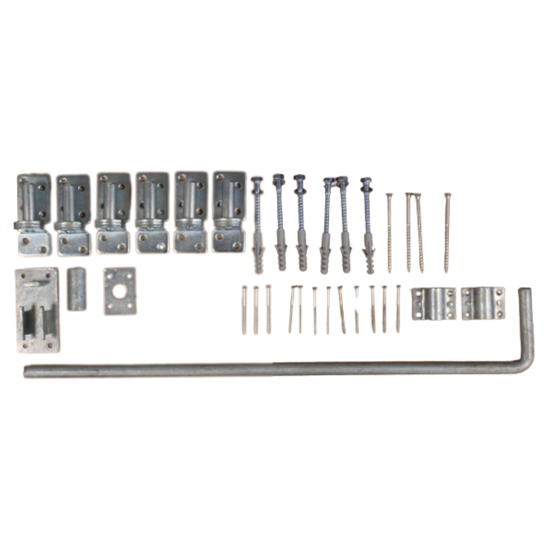 Inhoud set: 2x Kozijn hout, 1x Bovenregel kozijn, 1x Plank voor aanslag tussen de deuren, 4x Schroeven voor bevestiging van het kozijn, 6x Plaatduim inclusief schroeven voor bevestiging, 6x Slagpluggen voor bevestiging van kozijn aan de muur of paal (kozijn is niet geschikt om los in de grond te staan), 1x Grondpen, 2x Aanslaglat.