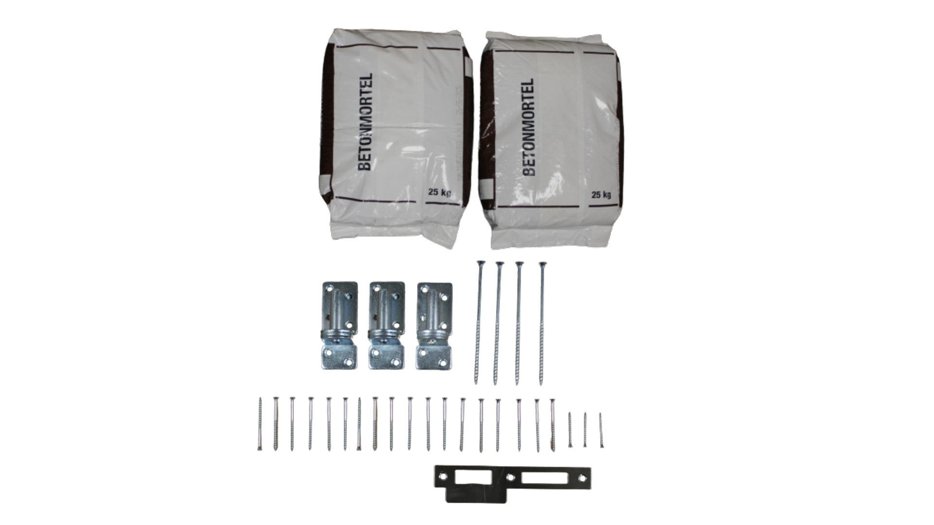 Inhoud set: 2x Kozijn hout verlengd (300cm), 1x Bovenregel kozijn, 4x schroeven voor bevestiging van het kozijn. 3x Plaatduim inclusief schroeven voor bevestiging., 2x 25kg betonmortel, 1x Sluitplaat voor dag-nachtslot inclusief schroeven, 1x Aanslaglat.