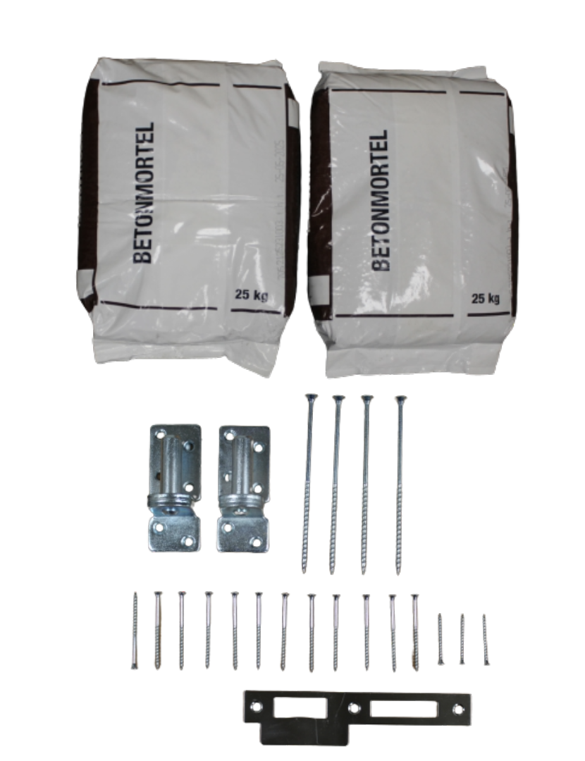 Inhoud set: 2x Kozijn hout verlengd (300cm), 1x Bovenregel kozijn, 4x schroeven voor bevestiging van het kozijn. 2x Plaatduim inclusief schroeven voor bevestiging., 2x 25kg betonmortel, 1x Sluitplaat voor dag-nachtslot inclusief schroeven, 1x Aanslaglat.